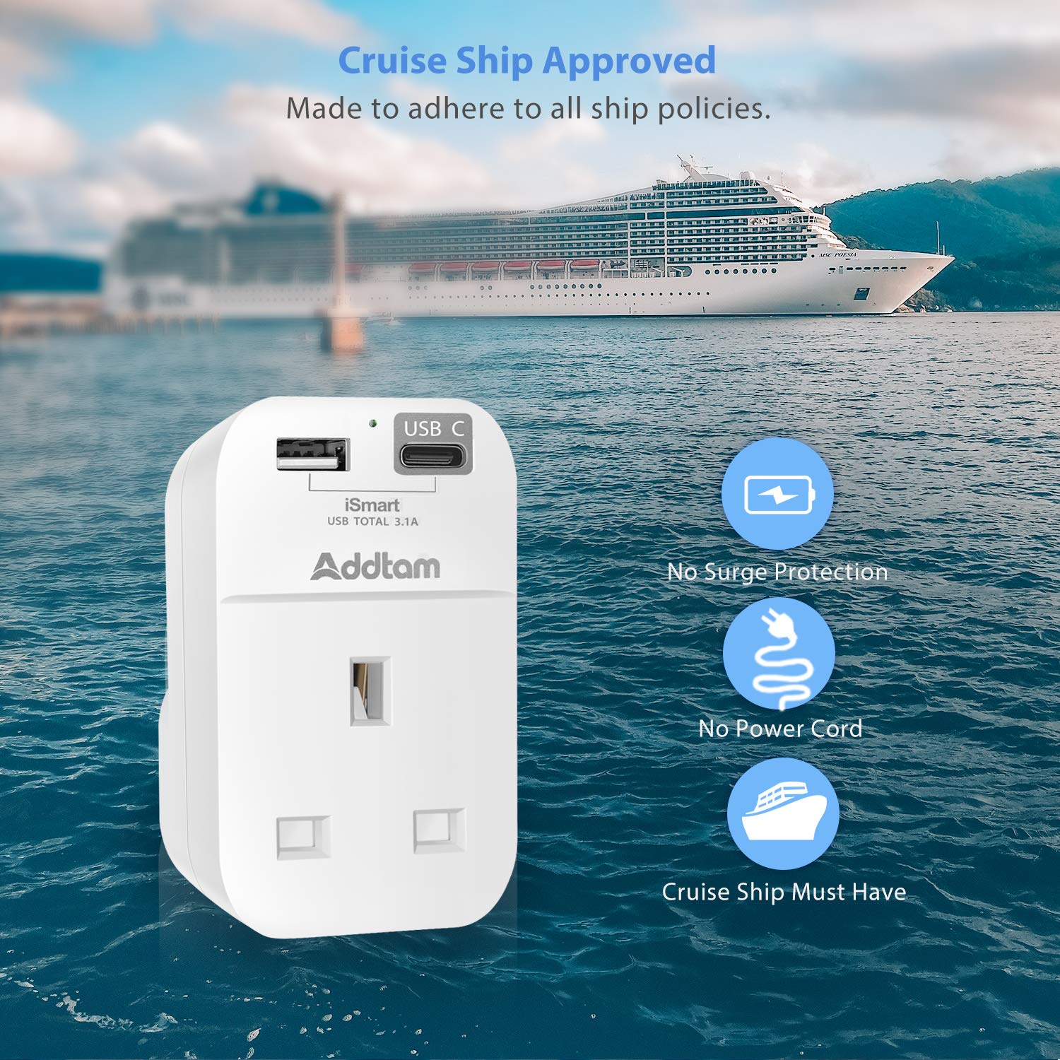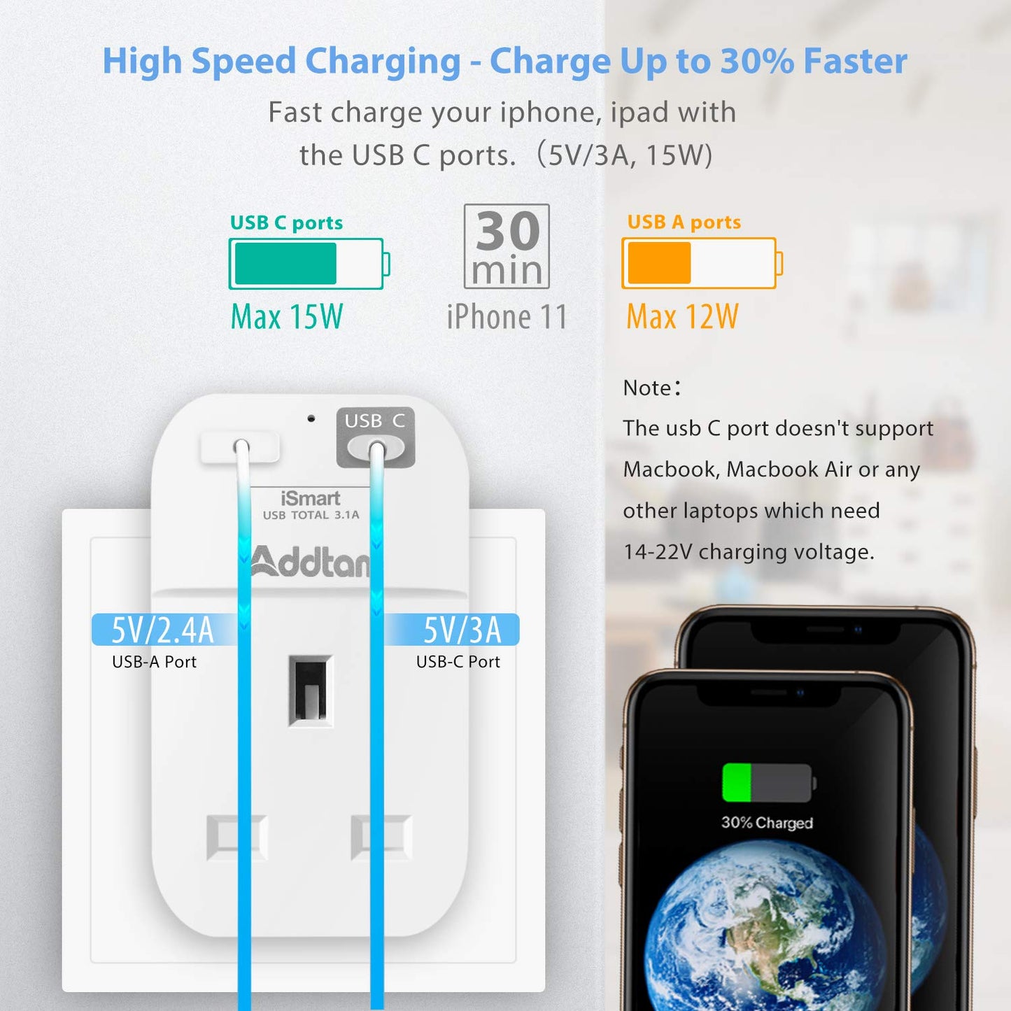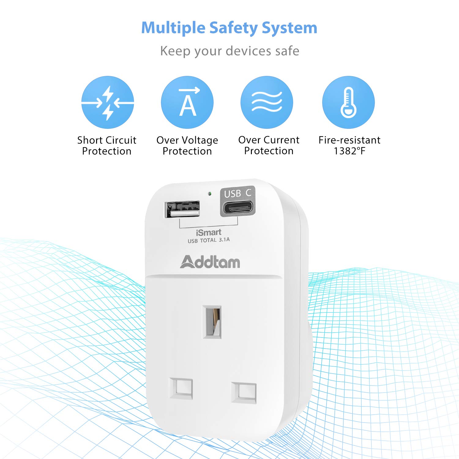 Addtam USB Plug Adaptor UK, Plug Extender with Cable-Free 1 Way 13A Wall Socket Adapter, Wall Plug Extension with 2 USB Slots(1 USB-C Fast Charging and 1 USB-A), Mini & Portable for Home/Office/Travel
