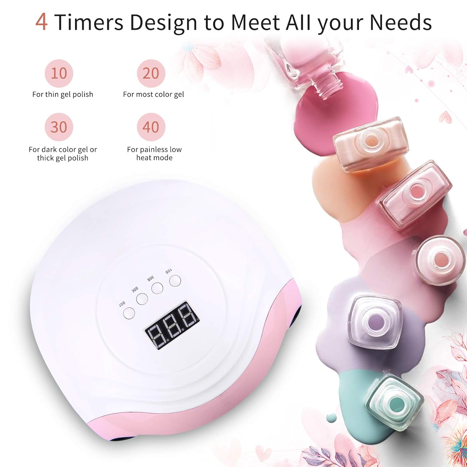 - 168 W LED nail dryer and super fast drying: 168 W UV LED lamp beads are based on advanced dual wavelength technology (365 nm + 405 nm), so they can be quickly dried to apply different types of nail polish, rhinestones and glue curing. Equipped with 36-long-lasting LED lamp beads at the same time, nail polish coated nails can be dried quickly and the curing time can be shortened by 80%.