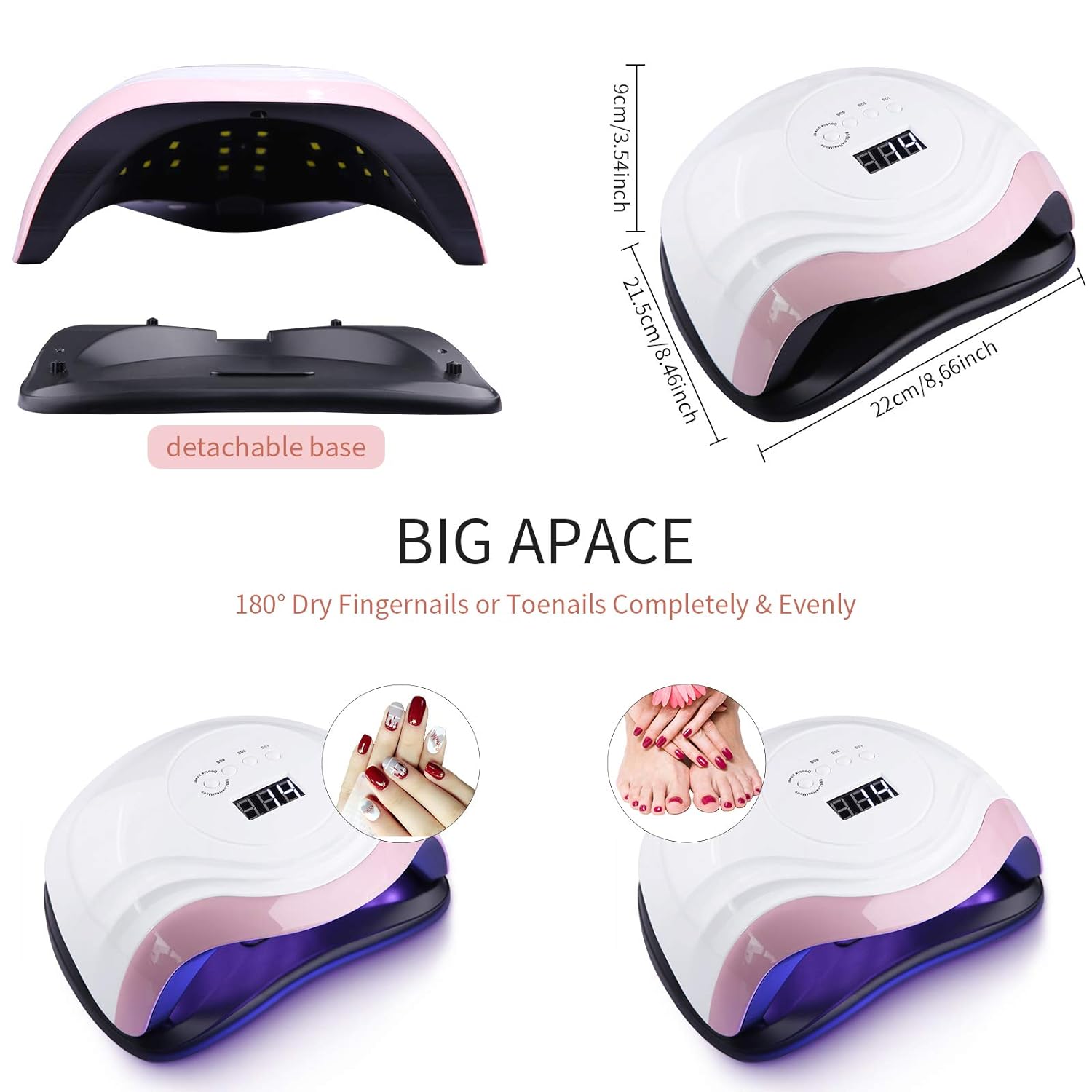 - Portable large room: UV LED nail light is easy to use. Simply connect it to the power supply. Even better is that this nail dryer has a large opening that allows you to dry 10 nails or 10 toenails at the same time. The white base is removable and the LCD display shows the curing time, making your manicure process more visible. You can use it on sofas, gardens and beds with power banks.