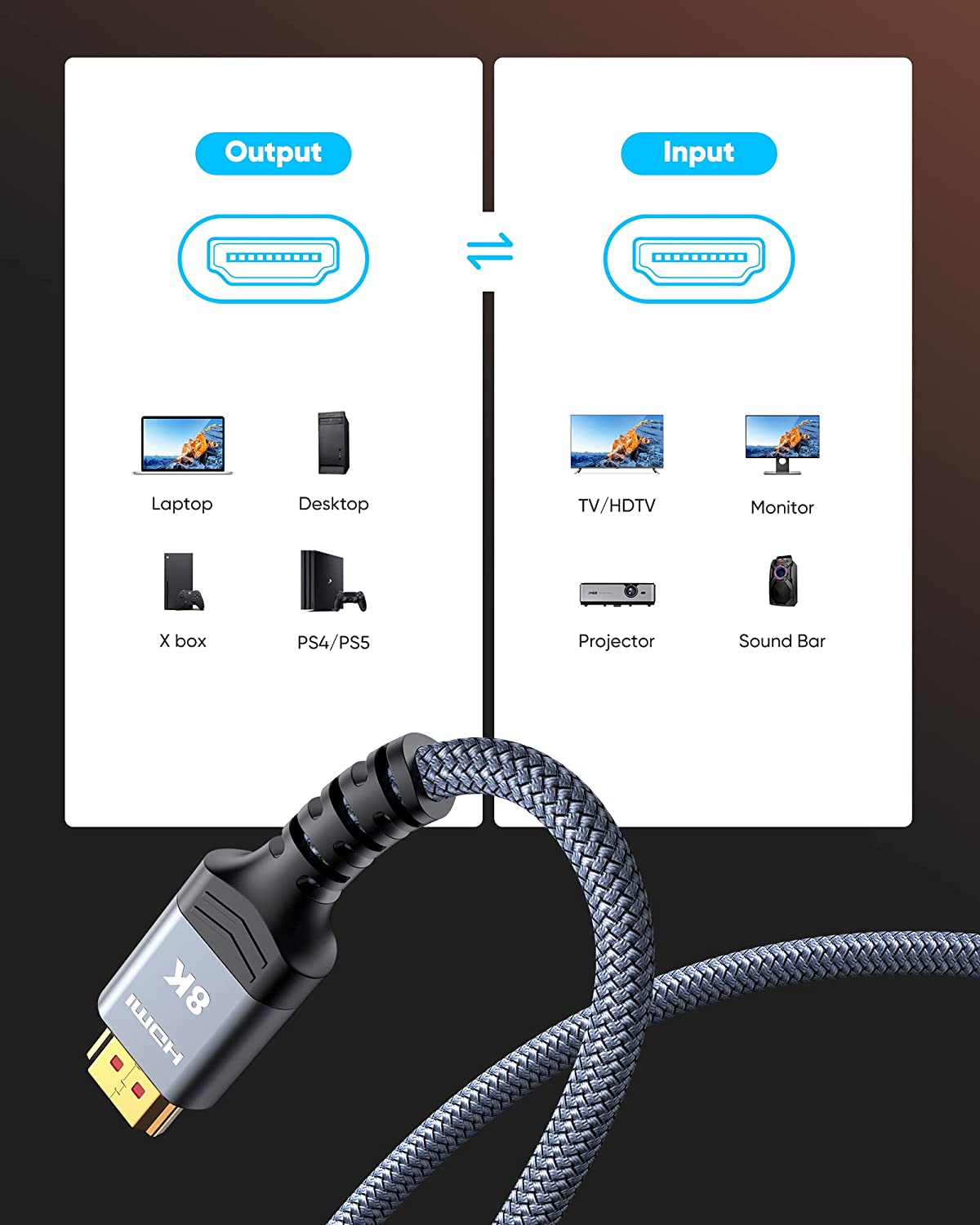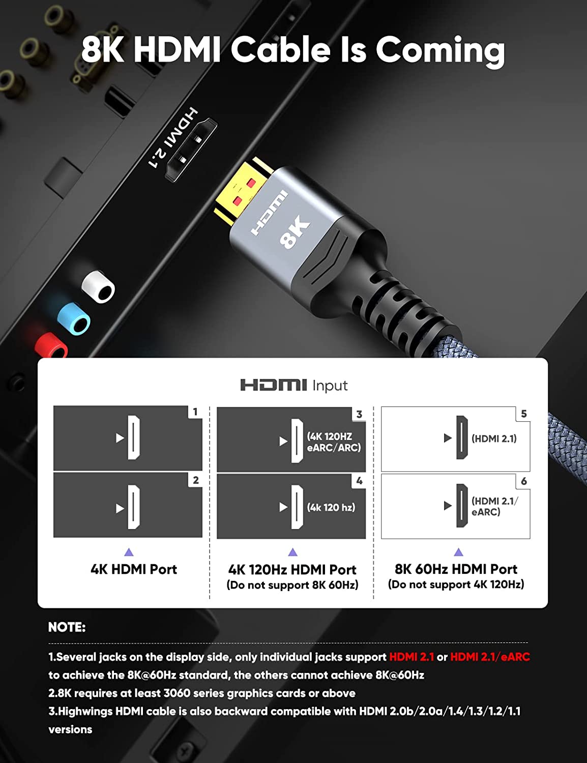 Long 8K HDMI Cable 25FT/7.6M 48Gbps, Highwings 2.1 High Speed Gaming Cord 4K@120Hz 8K@60Hz RTX 3090 eARC 3D Compatible for PS5, UHD TV and Blu-ray Player