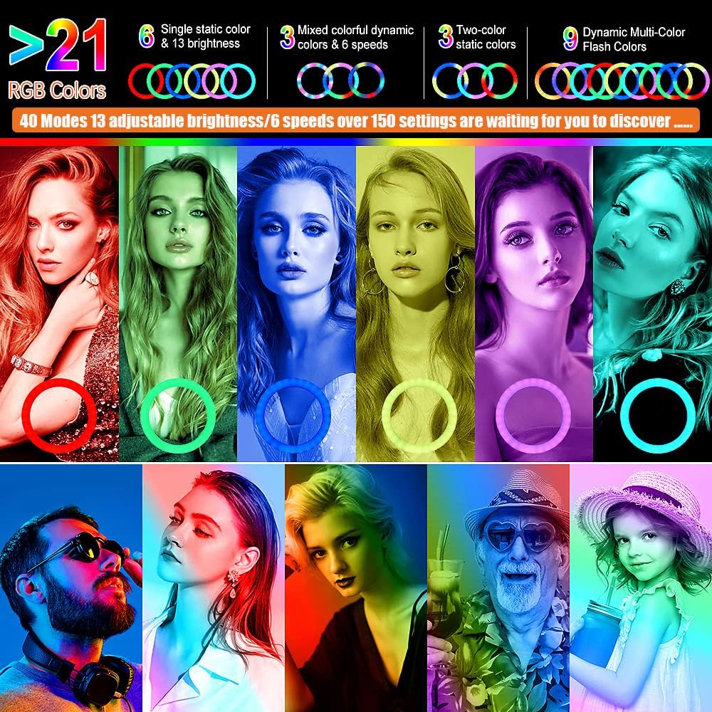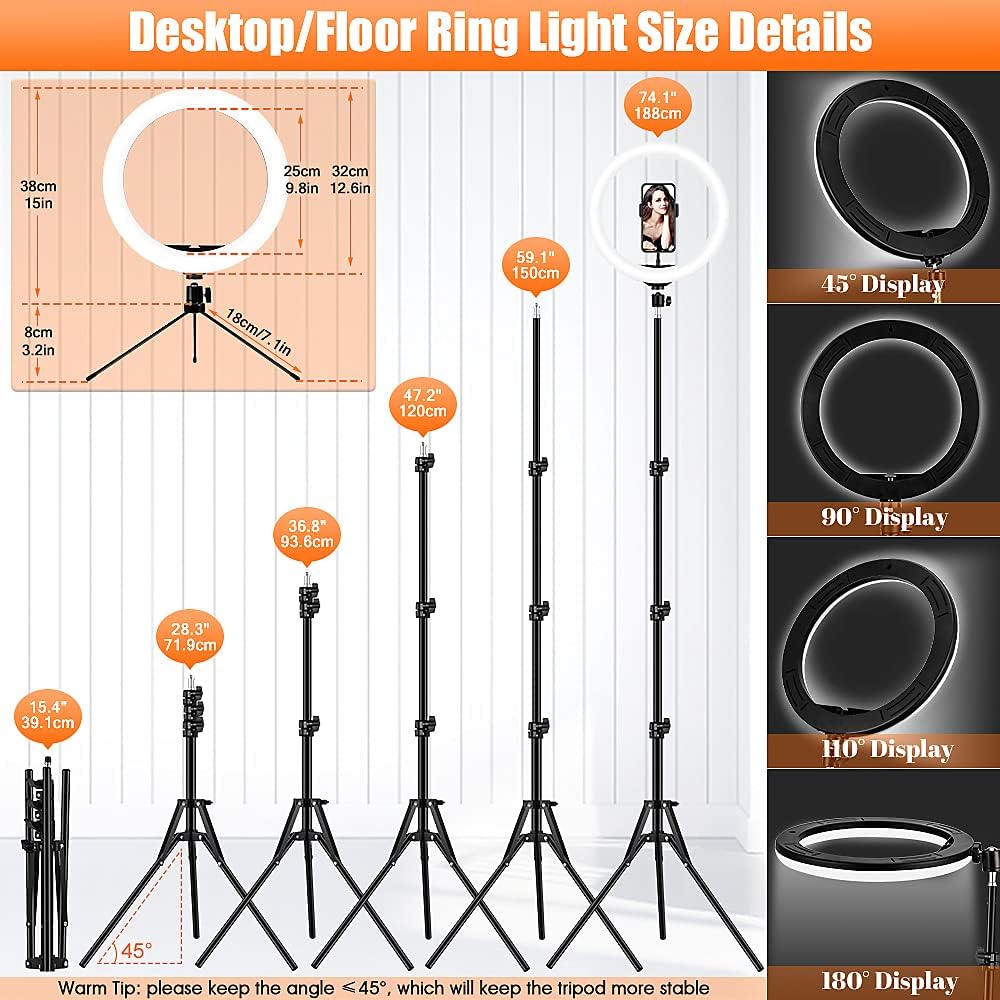 12.6'' Ring Light with Stand and Phone Holder: Totally 74" Tall Led Ringlight Tripod with 40 Color Modes, Floor and Desktop Stand with Circle Lights for Makeup Video Meeting Live Stream