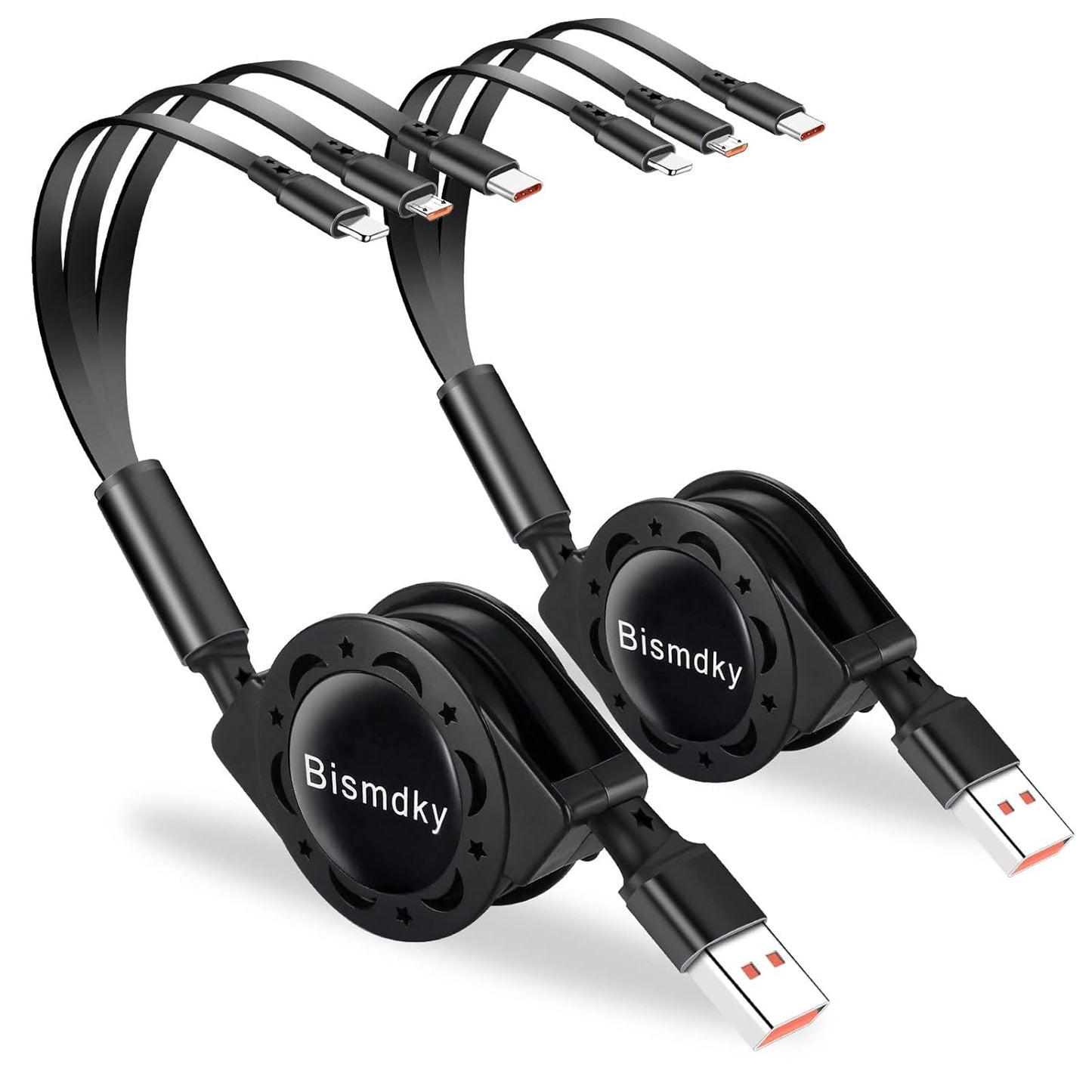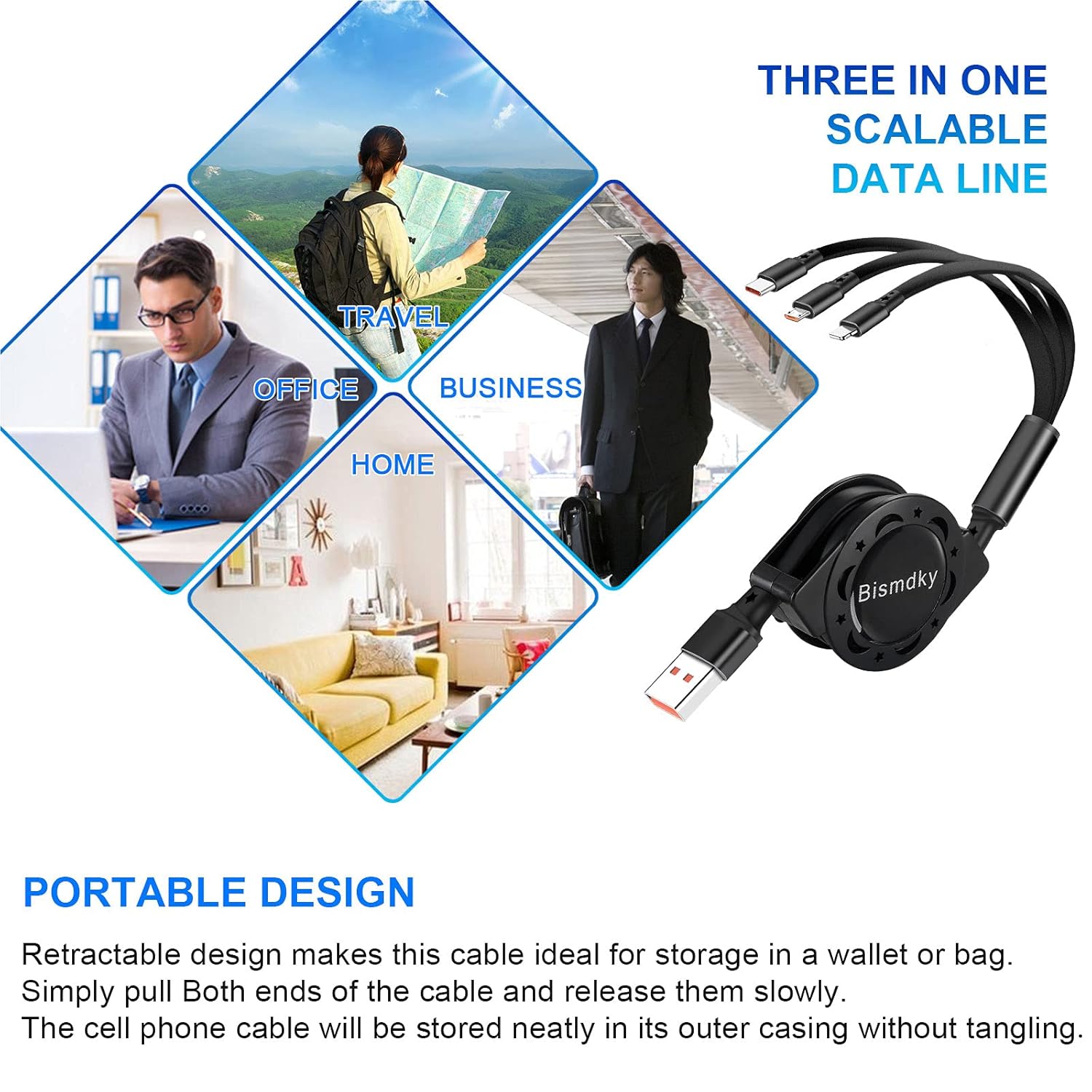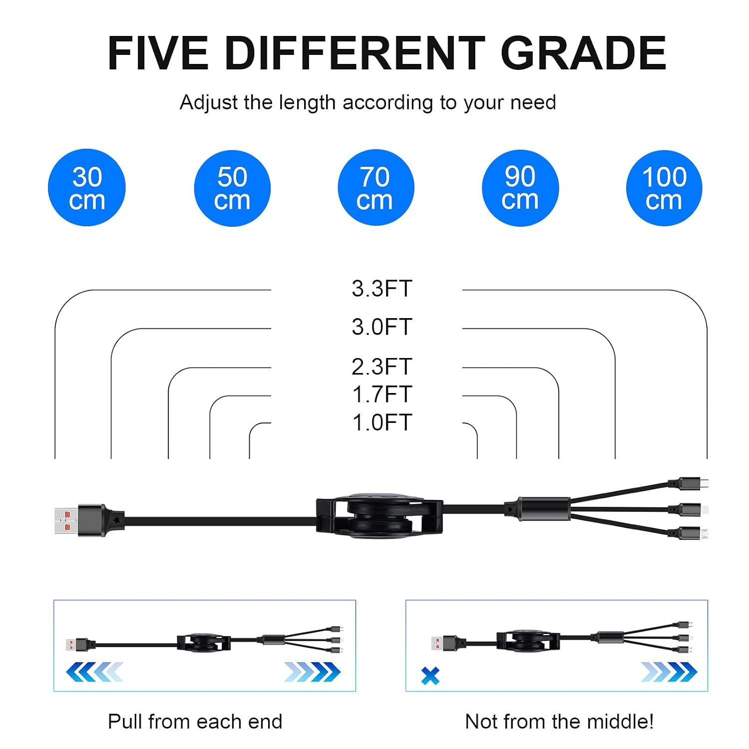 2 Pack 3 in 1 Multi USB Retractable Charger Cable,3A Multiple Charging Cord Adapter with IP/USB-C/Micro-USB Port Adapter, Fast Charging Compatible with Cell Phones Tablets Universal Use