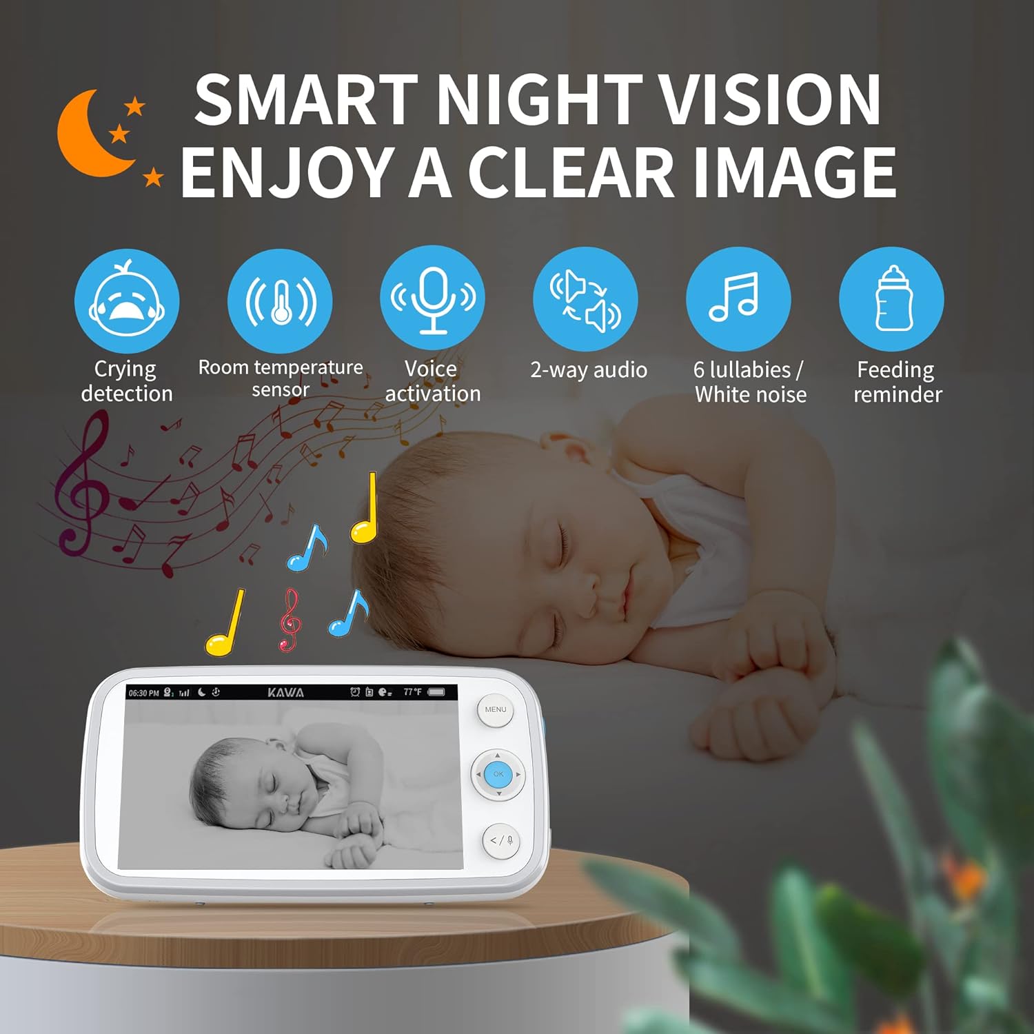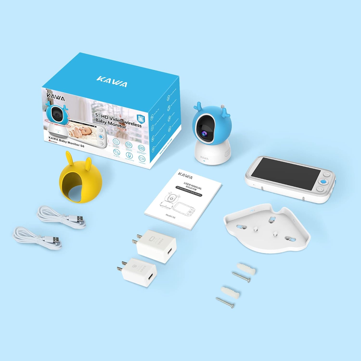 Baby Monitor, KAWA Video Baby Monitor with Camera and Audio, 5" 720P HD Display, No WiFi, Spilt Screen, Night Vision, 2-Way Talk, Temperature Sensor, 20Hrs Battery, Lullabies, 1000ft Range S6