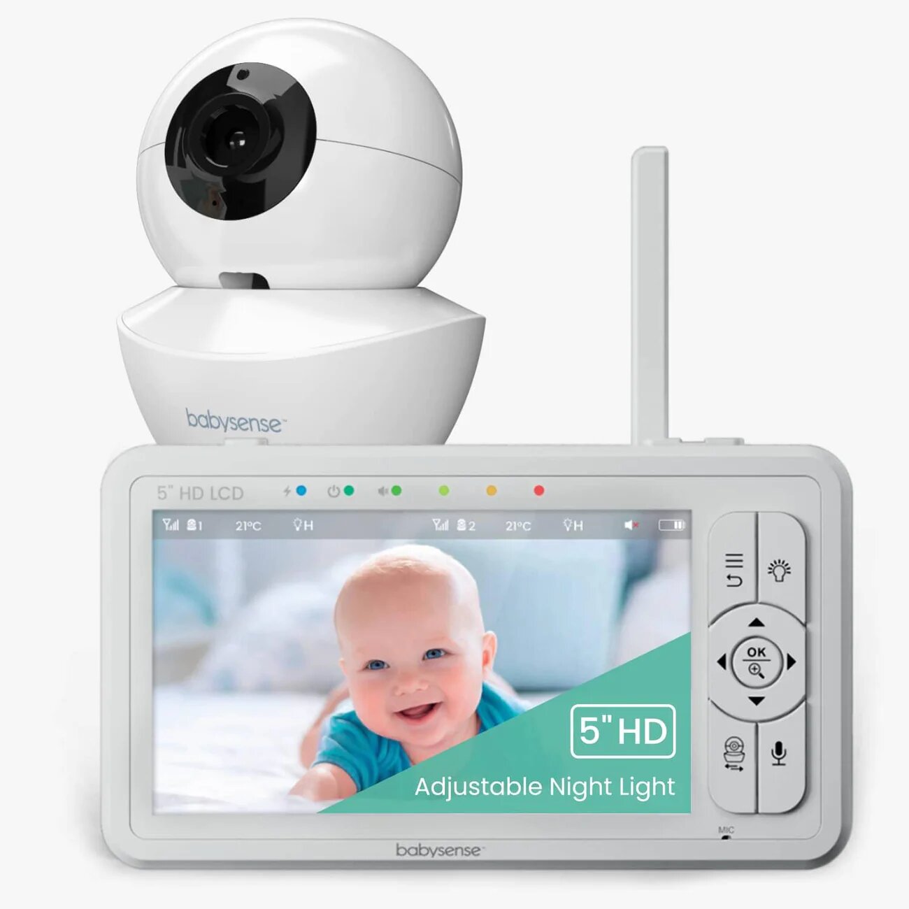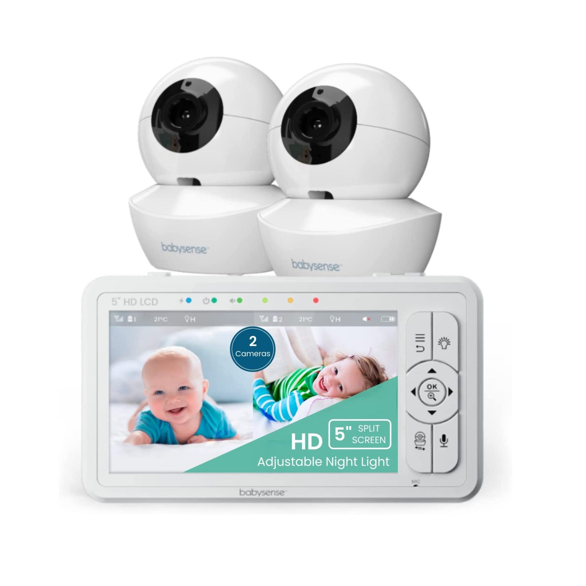Babysense 5" HD Split-Screen Baby Monitor, Video Baby Monitor with Camera and Audio, Two HD Cameras with Remote PTZ, Night Light, 960ft Range, Two-Way Audio, 4X Zoom, Night Vision, 4000mAh Battery