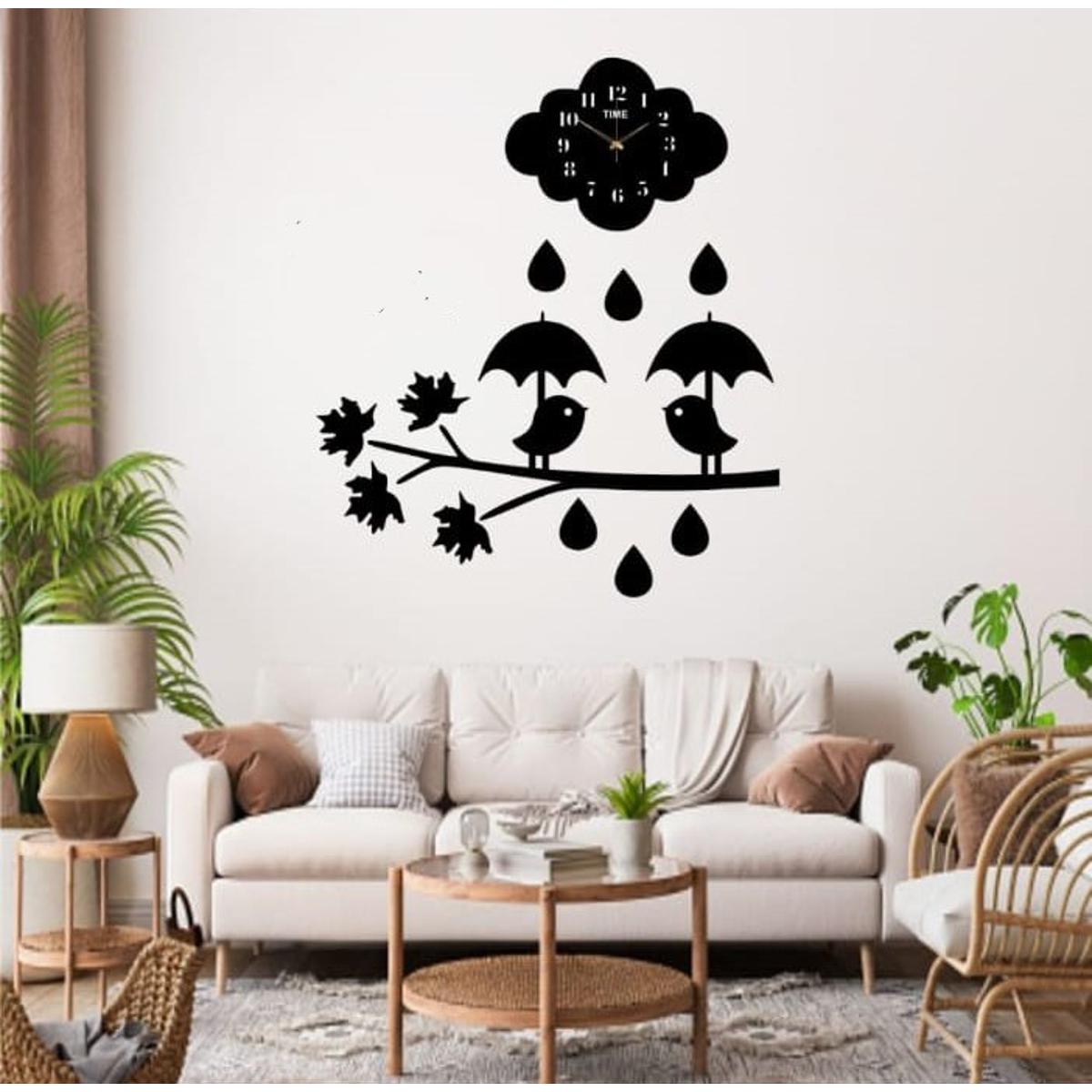 Birds on Tree under Rainy Sky 3D DIY Wooden Wall Clock Quartz Watch Laser Cut Design Decoration Piece for Girls Room, Home Decor and Living Room and for Gift Items