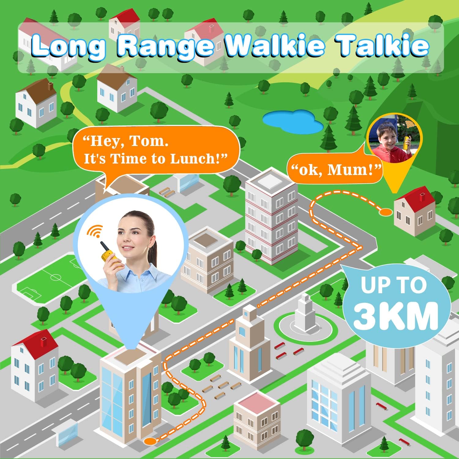 - Stable signal and long range: Fede children's walkie talkies contain 8 main channels and 99 sub-channels, so your children can use different channels with their friends and find a strong signal no matter where they are. Up to 3 km range under the open areas, up to 0.5-1 km under a living area, open up a world of possibilities for outdoor adventures