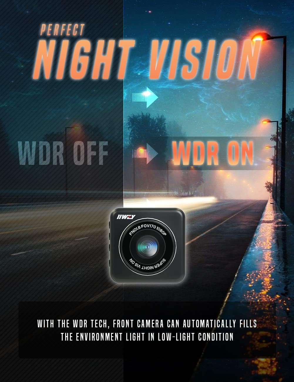 - Advanced Night Vision WDR Technology - The image quality mostly depends on the aperture of the lens. IIWEY DC05 model has F1.8 large aperture and WDR technology can effectively improves the camera’s image/video quality under high-contract lighting environment (Too dark or too bright). So this car dash camera can obtain a clear image easily even in low-light environments.