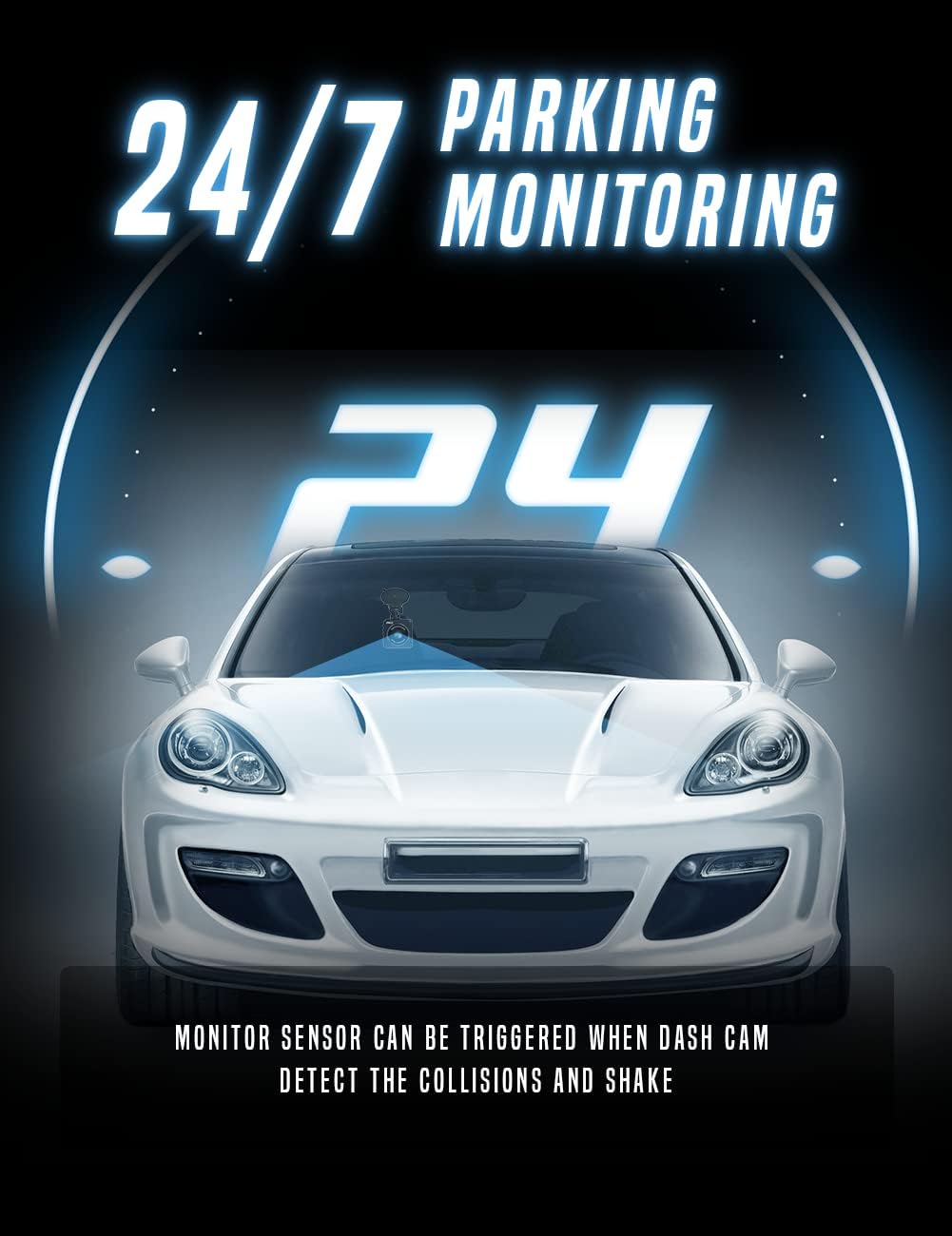 - 24Hours Parking Monitoring - Triggered by parking monitor, the dash cam will automatically power on and start recording whenever an impact is detected. (Due to the built-in battery is very small, so if you want to use this function well you need to hardwire your dash cam, hardwire kit ASIN: B07Q29JZZY).