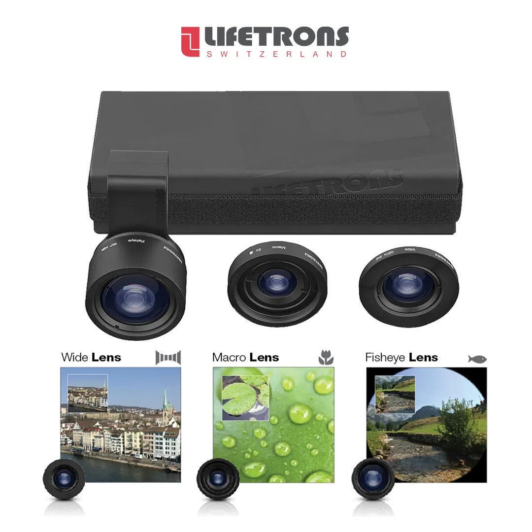This Lifetrons travel lens set includes interchangeable fisheye, macro and wide lenses for incredible photographic results.