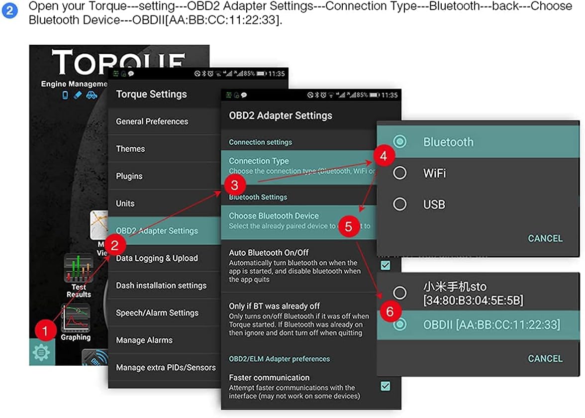 3.Download the app" Car Scanner ". Enter the App and Settings Menu and Select Connection.