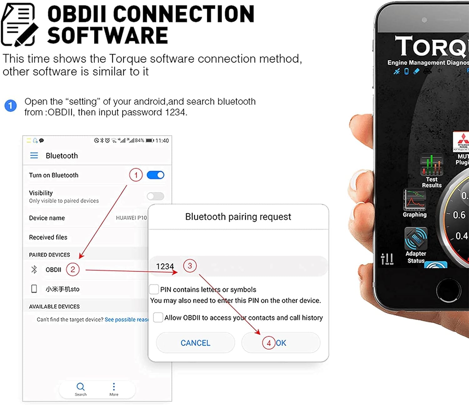 Open the Bluetooth / Choose the " OBDII" in phone setting. Bluetooth pairing pin is 1234 . Click the App Settings- OBDII adapter setting- Connection Type/Choose “Bluetooth “. Bluetooth Settings/Choose OBDII.