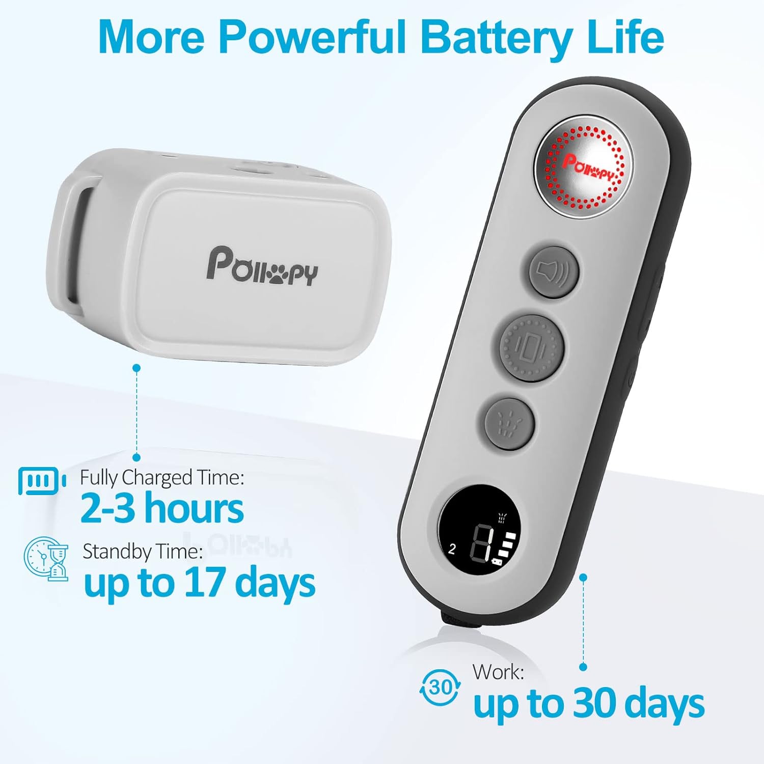 300mA Rechargeable Li-ion battery can be fully charged in 2 hours, and lasts up to 17 days for the collar and 30 days for the remote.