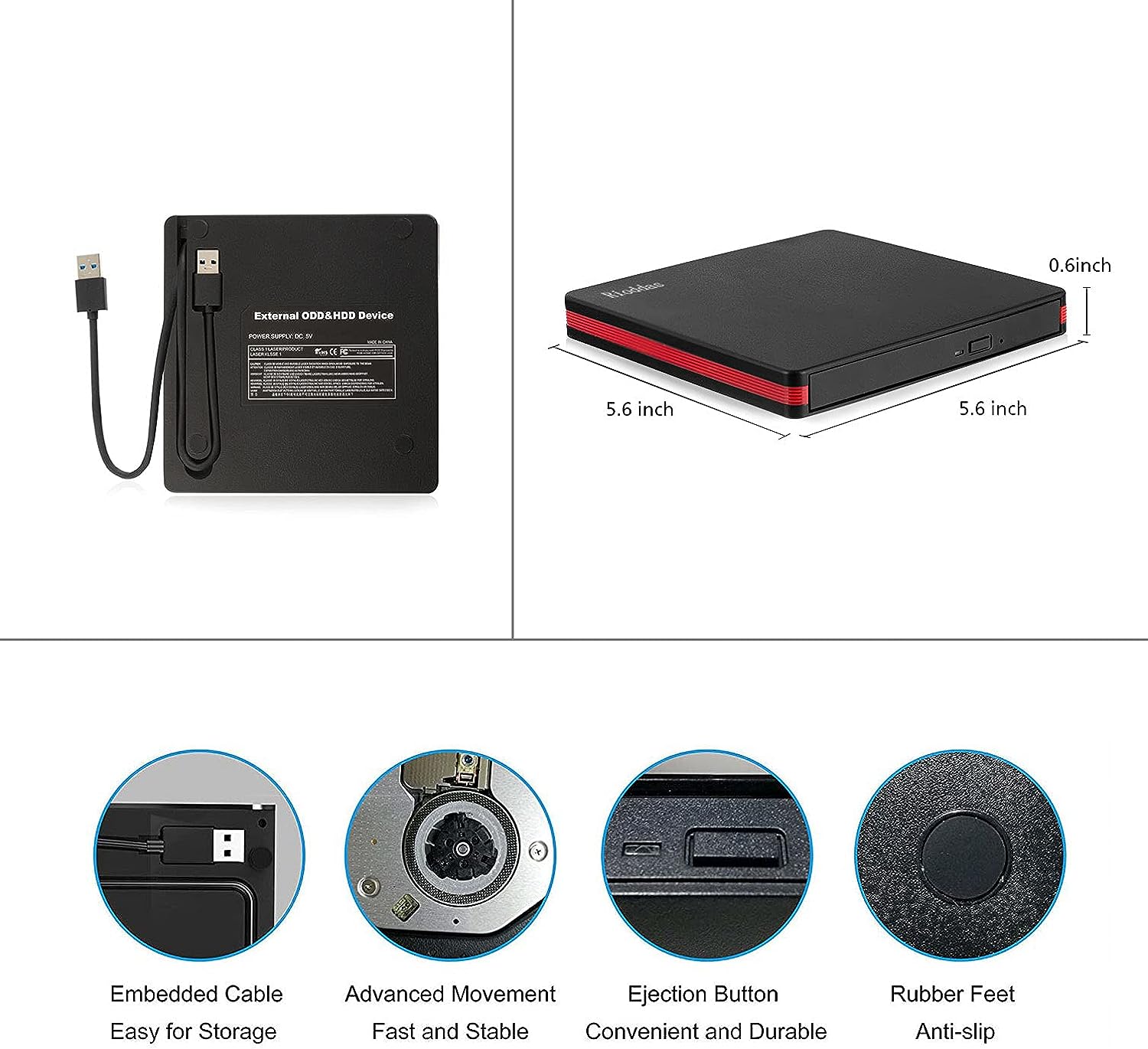 Product Description  Safety Tips:1.Do not have the machine on a strong magnetic object nearby. 2.Keep the machines steady on the desktop, do not put it unstable items. 3.Do not put the machines on the vulnerable to squeeze place, to ensure normal machine use. 4.Internal laser light source may be harmful to the eyes of the face, please do not look directly.       Intelligent techEmbedded cable design, worry- off cable missing any when and where. Designed with eject button. The copper mesh technology of this external component, you can be rest assured of stable data transmission. Slim & PortableSlim design and lightweight allow us to carry and use this portable external CD/DVD drive burner anytime, anywhere no matter you are at home, in the office, or during a trip. *Approximate size: 5.6 x 5.4 x 0.6 inches Extra Power Supply CordPlug and Play, no additional applications or drives required. When the DVD drive does not work properly, use the included power cord to connect an extra power source.  Precautions for Use:1.Please make sure your computer has an available media player (such as VideoLAN VLC player), burning, or ripping software before using it. 2.If the USB port you are using can not provide enough power for this device through a single data cable, please use the attached USB power supply cord. 3.Data transfer speed is also affected by computer and system environment. 4.Setting area code according to different regions. 5.The dvd drive should be connected with USB port on laptop rather than connect with USB HUB. In addition, please connect the item with USB port behind of computer host if you use a desktop.  Warm Tips:1. Please hook up the device to the direct USB port on your computer. If you connect it to a USB hub or extension cords, it maybe cannot recognize the Driver or not read the CD/DVD. 2. The newly released Windows system has stopped using external DVD media player software. If your device system is Windows 10 or above, when DVD cannot be played normally, please install VLC media player to play DVD or CD. 3. The cable length of our CD drive is 9.4 inches, and the integrated USB cable is convenient for storage. If the cable is too short to use, you can consider buying a USB3.0 extension cable to increase the use distance. 4. This usb cd player cannot be connected directly to a car, but you can created diks with it and then play the disk created on car cd player.