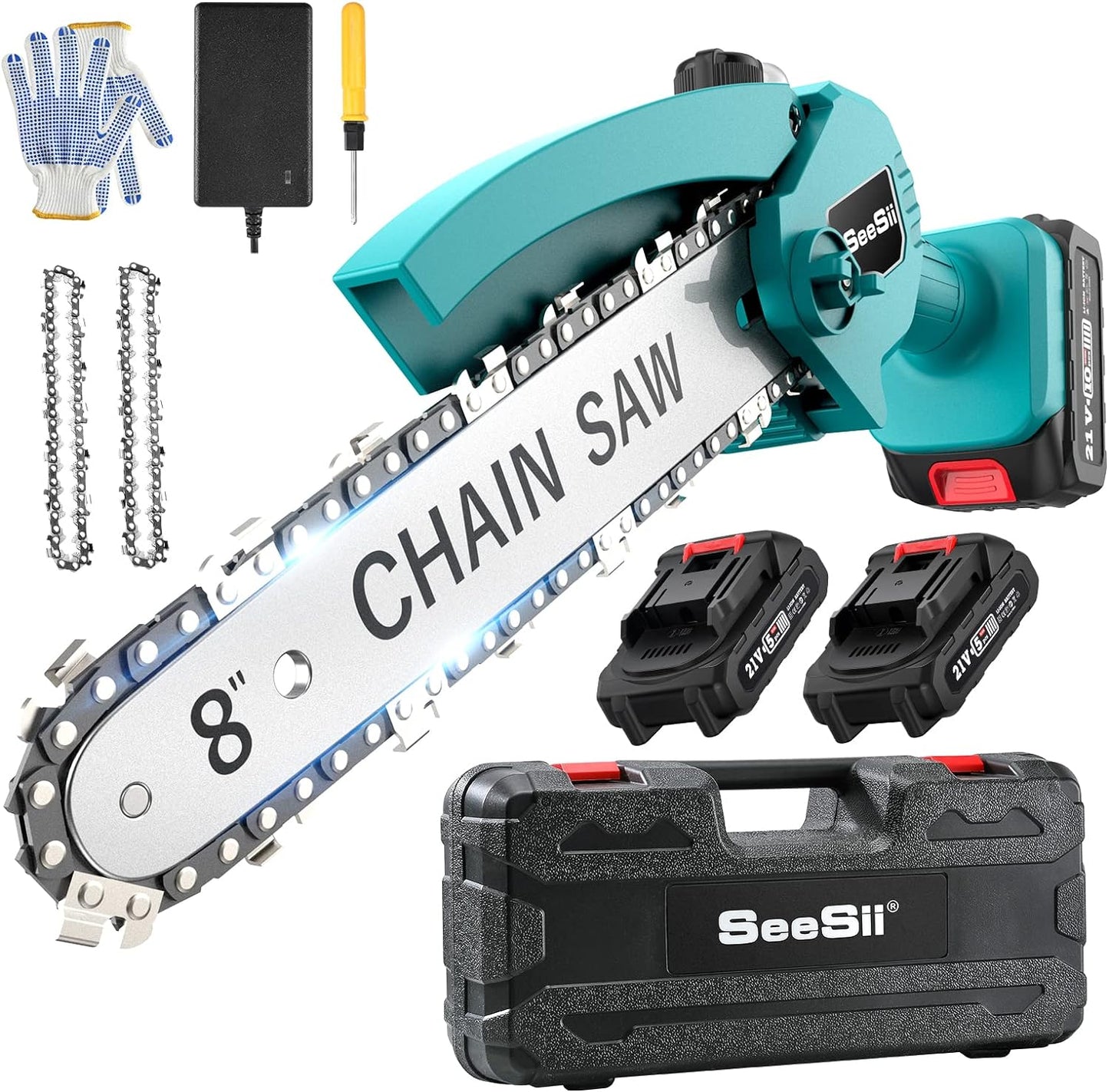 SeeSii 8 Inch ChainSaw , Cordless Chainsaw with 2x 2.0 Battery Auto-oil System One-Handed Electric Chain Saw Electric Pruning Chainsaw for Wood Cutting Garden Logging Trimming Branch