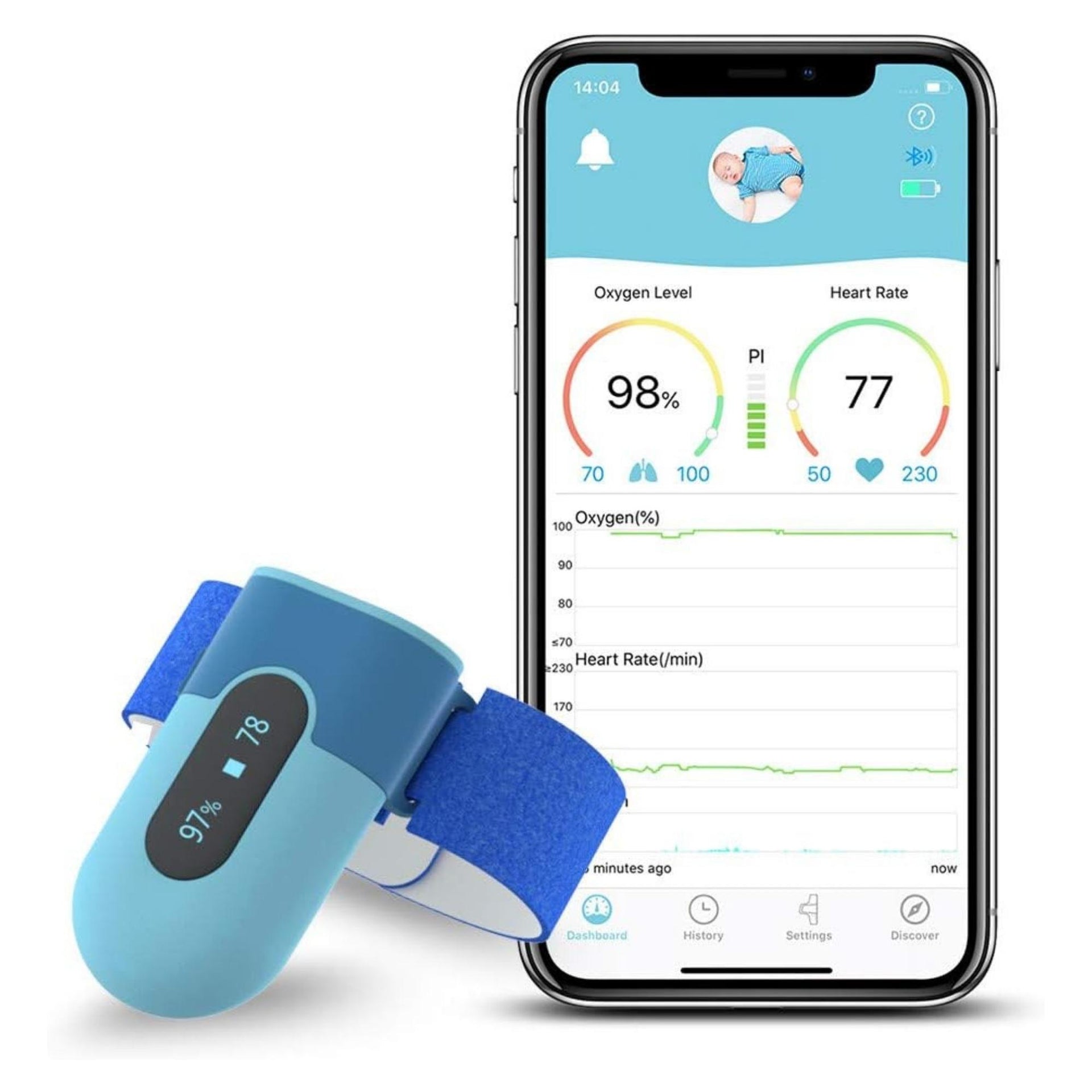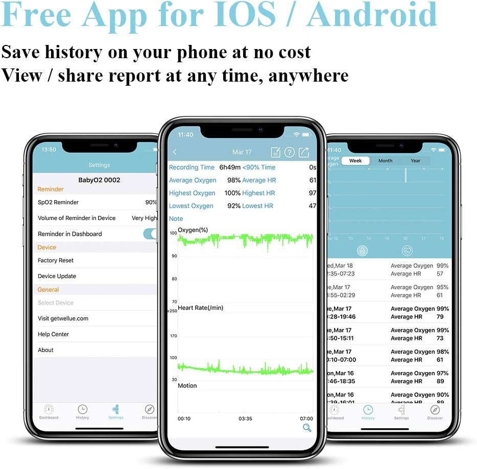 FREE APP FOR IOS & ANDROID: The free app allows you to monitor your baby's real-time oxygen saturation, heart rate and body movements during sleep and daily life. Review history records & receive alarm instantly.