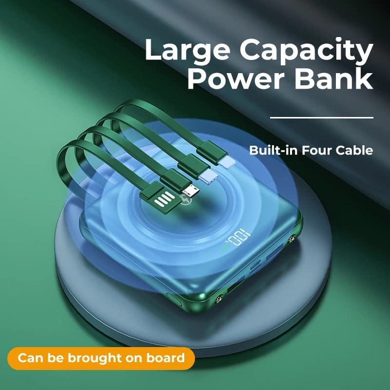 - BUILT-IN 4 CABLE - There is no need to worry about carrying additional cables because with four built in cables you will always have the correct cable for your device with you. The built-in cables including USB/Micro USB/Type C/Lightning connectors are stored inside the power bank making it a lot more organised and convenient. If that's not enough there is also a separate charging cable included.