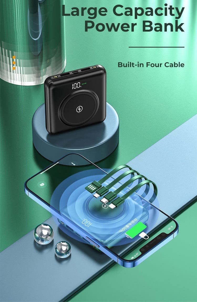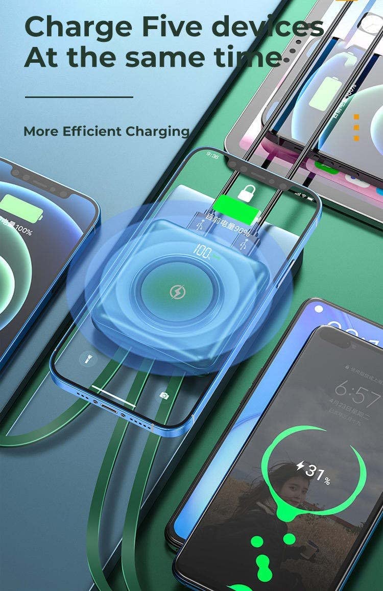 - 20000mAh MINI POWER BANK - This portable mini power bank comes with 4 built in cables and lets you charge upto 5 devices at the same time. The ultra-high 20000 mAh capacity means you can charge multiple devices simultaneously several times. It has enough power to charge phones, tablets and and other devices with ease. Wireless connectivity for compatible devices.
